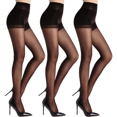 3 Pairs Sheer Tights For Women 20D Pantyhose Control Top Invisible Reinforced Toes Black or Nude