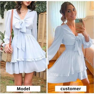 Women Tie Front Elastic Waist Tiered Ruffle Layer Floral Balloon Long Sleeve V-Neck A-Line Mini Dress