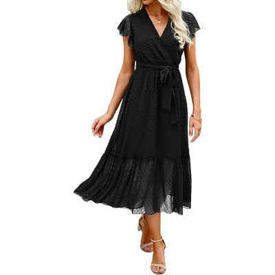 Women's V Back Inslace Layered Ruffle Hem Flutter Sleeve Dress