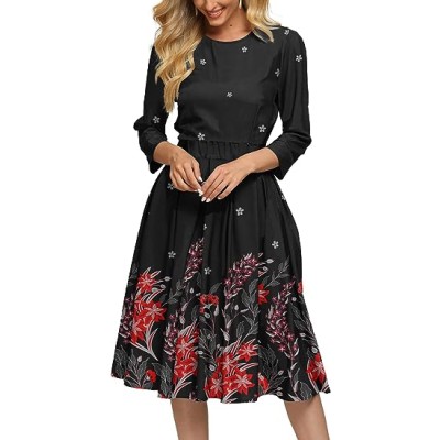Women's Floral Vintage Dress Elegant Midi Evening Dress 3/4 Sleeves