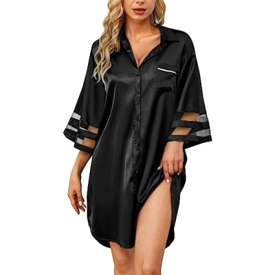 Satin Nightgown For Women 3/4 Sleeve Silk Nightshirt Button Down Pajamas Dress Boyfriend Sleepshirt S-XXL